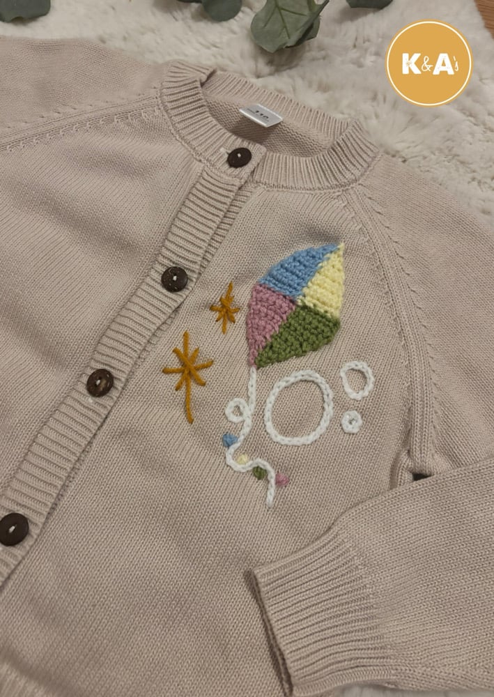 This beautiful neutral knit in size 3-4 years feature wording “lets go fly a kite” on the back with crochet kite and cloud details, with a smaller kite on the front chest finished off with bubbles and star burst 🪁☁️🫧✨