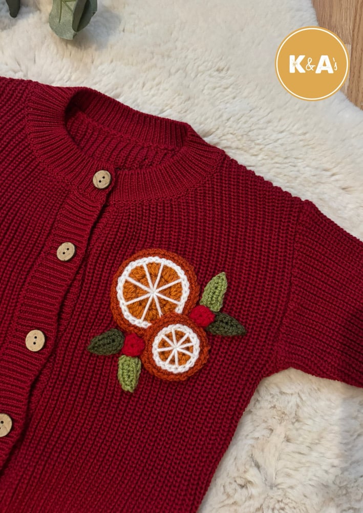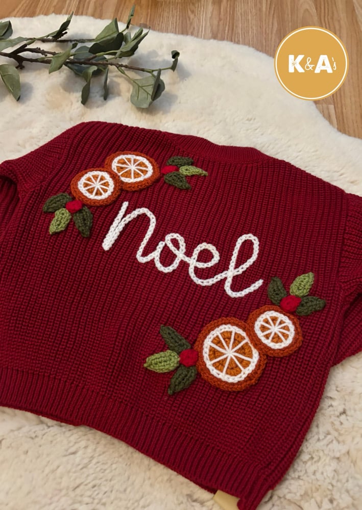 This lovely burgundy oversized for cardigan in 6-12 months features wording “Noel” surrounding by clementine slices and holly foliage